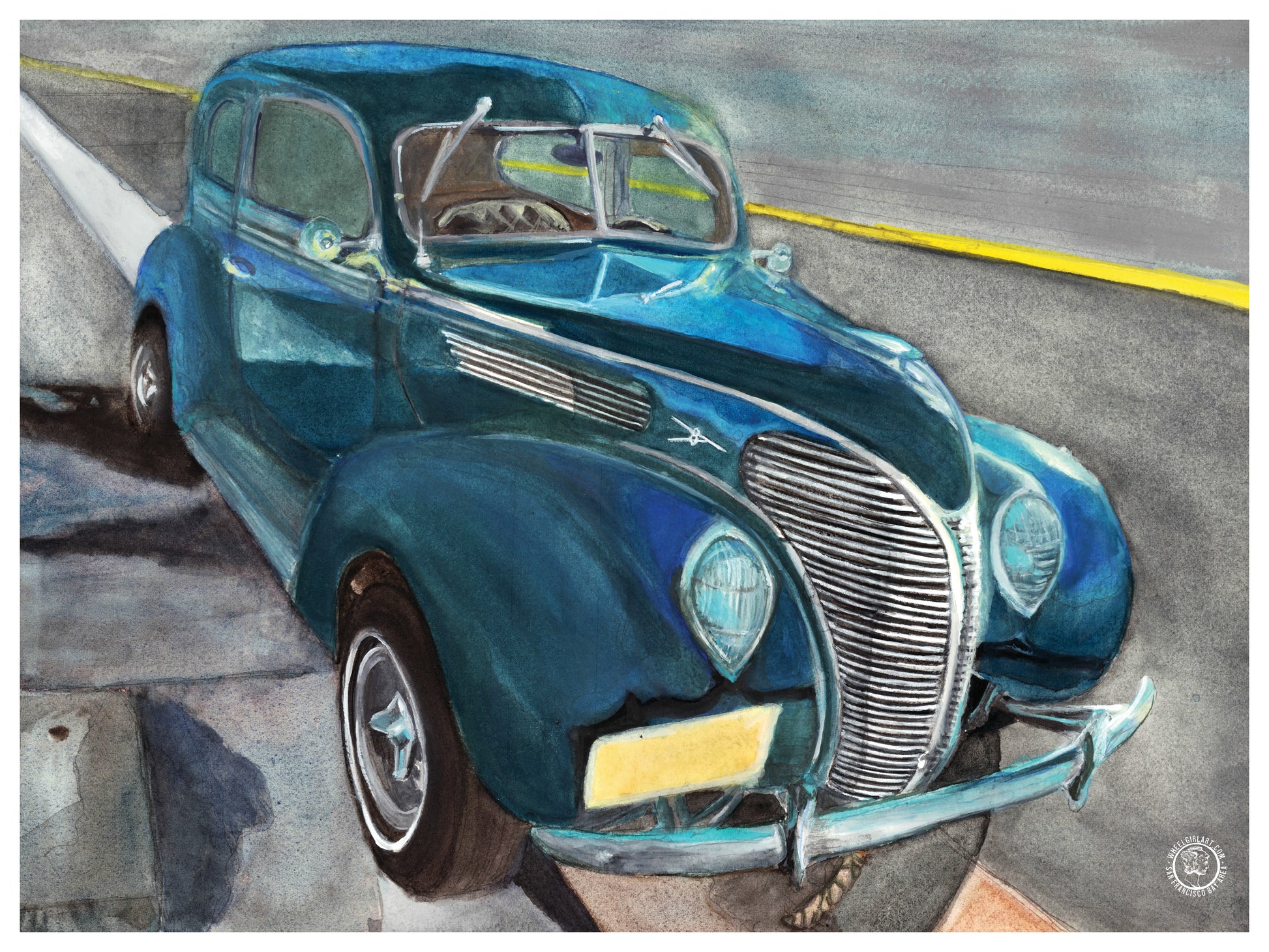 Wheelgirlart 1938 Ford Tudor Deluxe Blue Black is a 16in wide x 12in high fine art HD ChromaLuxe® lightweight, modern aluminum metal print. These lightweight, colorful, modern metal prints look great in any room, and they are water and humidity resistant, so they are also suitable for many types of sheltered outdoor rooms, garages, kitchens, and bathrooms. The image is infused onto the aluminum metal matte white surface via a permanent heat-and-pressure process. The hanger attached to the back of the aluminum panel floats the image away from the wall and creates an attractive shadow line. No frame is required. (All Wheelgirlart HD ChromaLuxe® metal prints are reproductions of original hand-painted artwork.)