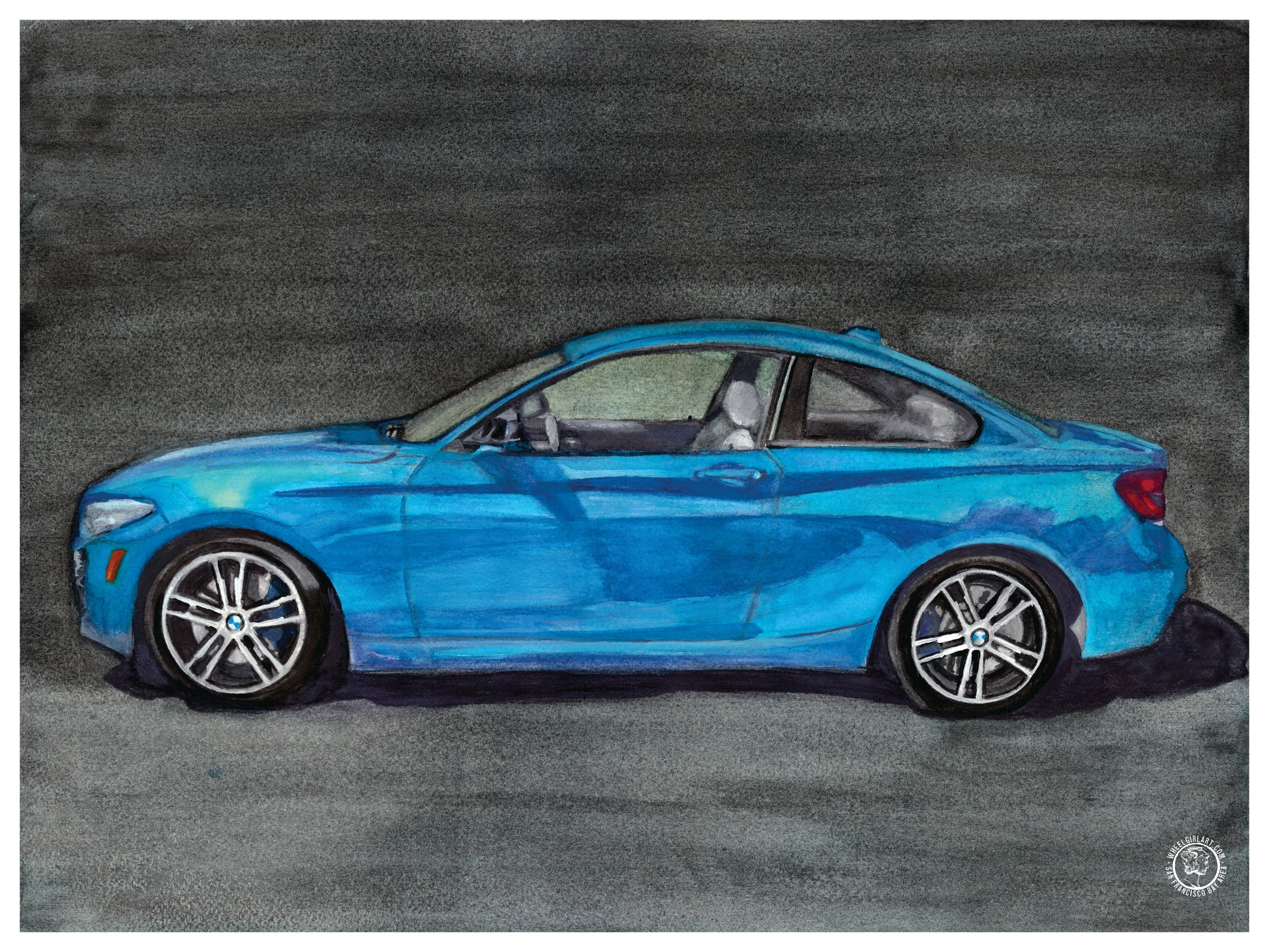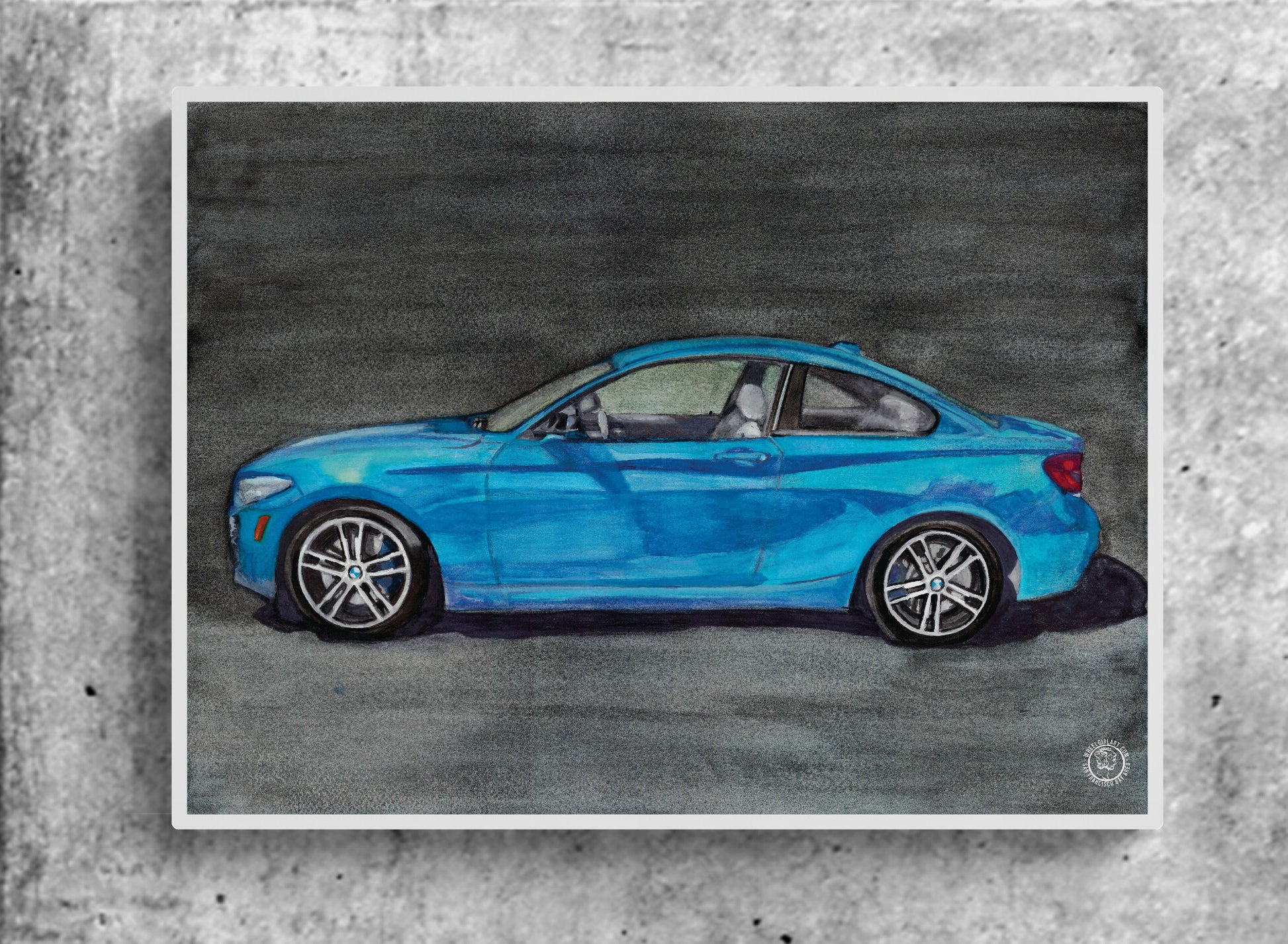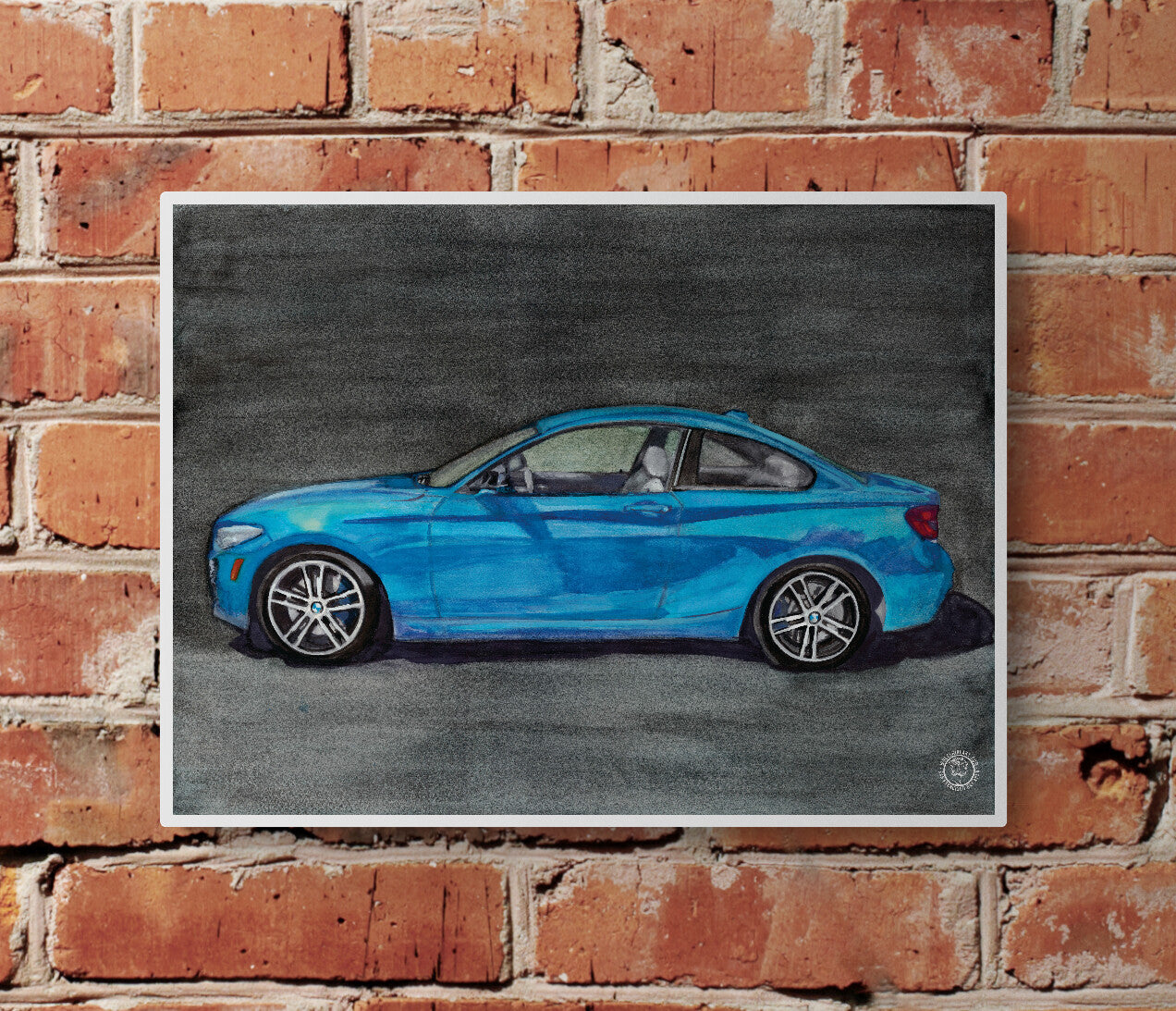 Wheelgirlart 2021 BMW M240i Coupe Blue is a 16in wide x 12in high fine art HD ChromaLuxe® lightweight, modern aluminum metal print. These lightweight, colorful, modern metal prints look great in any room, and they are water and humidity resistant, so they are also suitable for many types of sheltered outdoor rooms, garages, kitchens, and bathrooms. The image is infused onto the aluminum metal matte white surface via a permanent heat-and-pressure process. The hanger attached to the back of the aluminum panel floats the image away from the wall and creates an attractive shadow line. No frame is required. (All Wheelgirlart HD ChromaLuxe® metal prints are reproductions of original hand-painted artwork.)