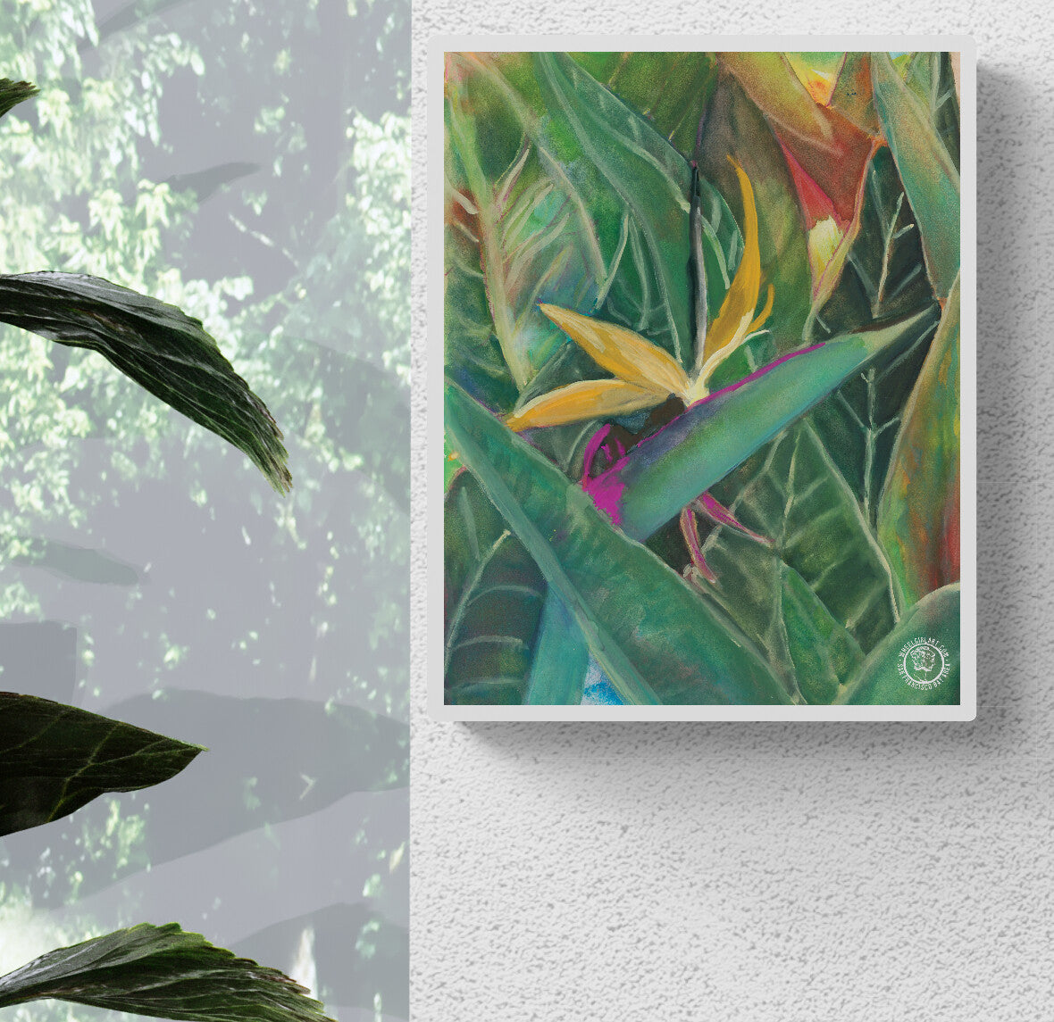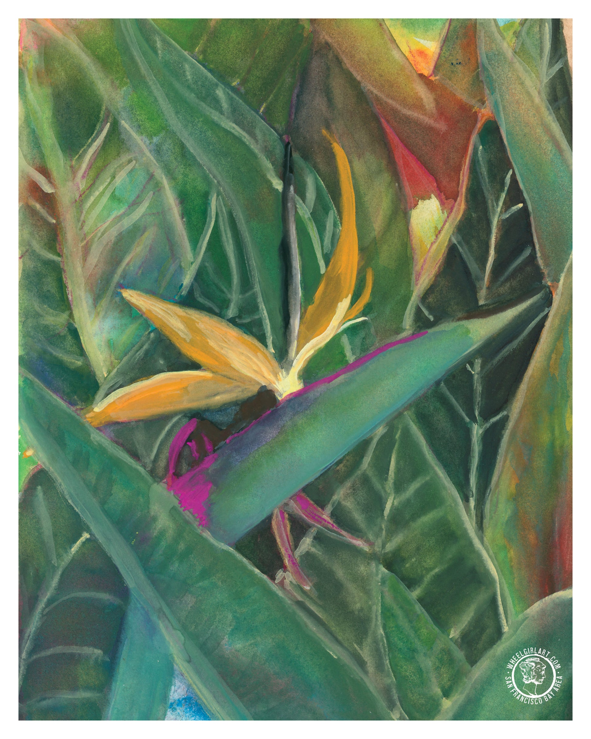 Wheelgirlart Bird of Paradise is an 8in wide x 10in high fine art HD ChromaLuxe® lightweight, modern aluminum metal print. These lightweight, colorful, modern metal prints look great in any room, and they are water and humidity resistant, so they are also suitable for many types of sheltered outdoor rooms, garages, kitchens, and bathrooms. The image is infused onto the aluminum metal matte white surface via a permanent heat-and-pressure process. The hanger attached to the back of the aluminum panel floats the image away from the wall and creates an attractive shadow line. No frame is required. (All Wheelgirlart HD ChromaLuxe® metal prints are reproductions of original hand-painted artwork.)