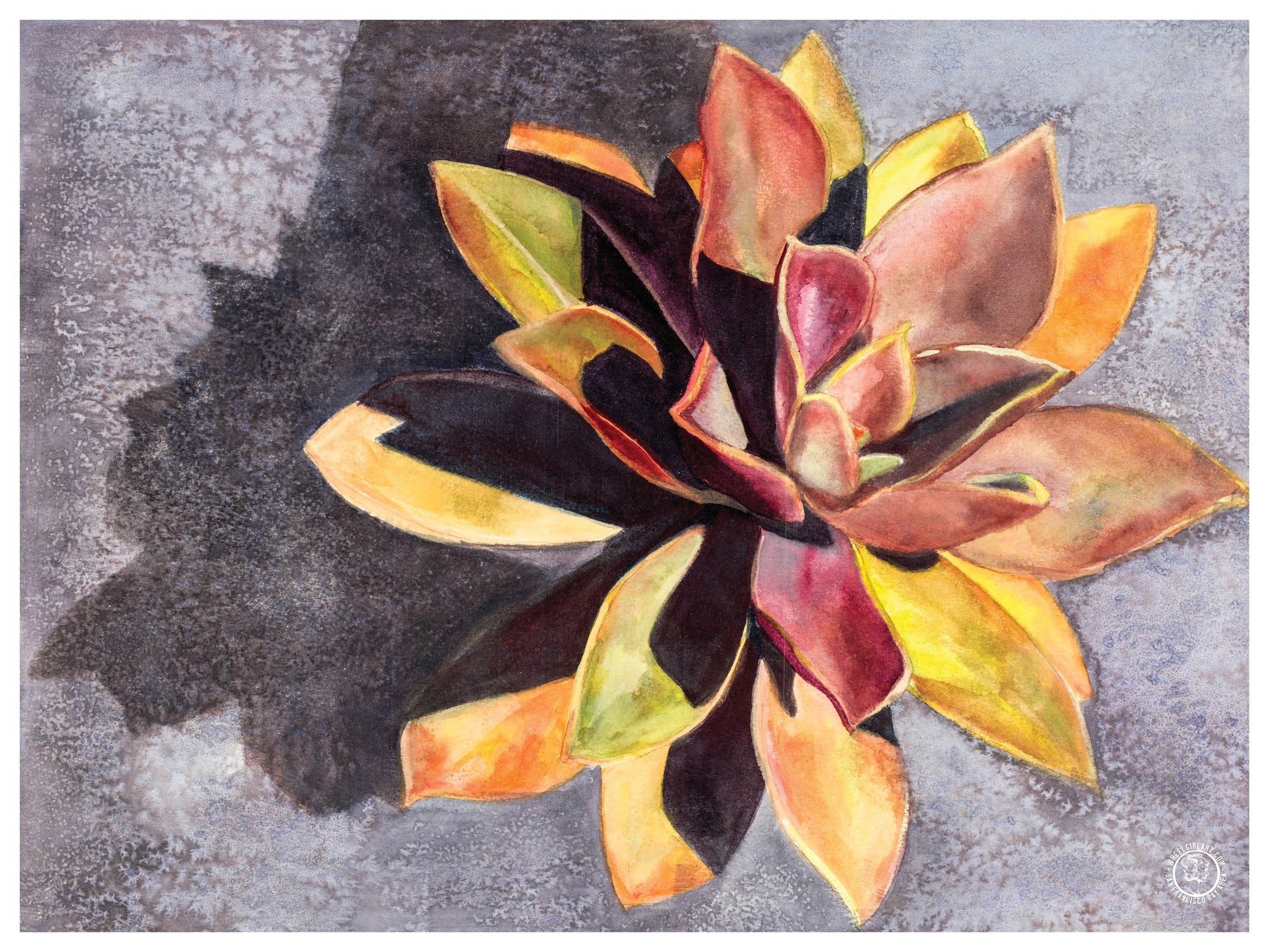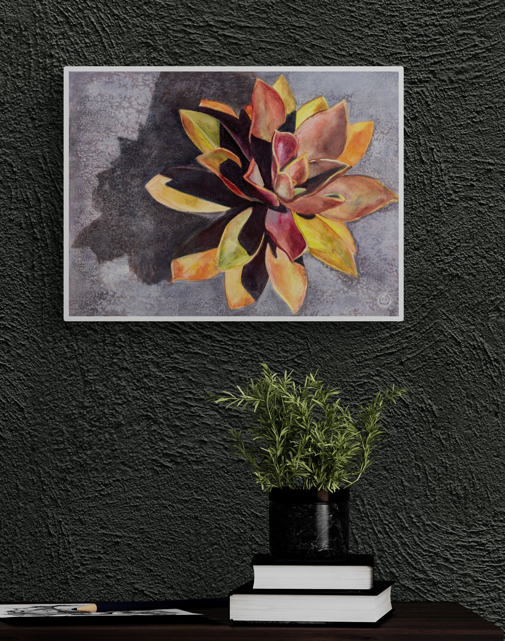 Wheelgirlart California Sunset Succulent No. 2 is a 16in wide x 12in high fine art HD ChromaLuxe® lightweight, modern aluminum metal print. These lightweight, colorful, modern metal prints look great in any room, and they are water and humidity resistant, so they are also suitable for many types of sheltered outdoor rooms, garages, kitchens, and bathrooms. The image is infused onto the aluminum metal matte white surface via a permanent heat-and-pressure process. The hanger attached to the back of the aluminum panel floats the image away from the wall and creates an attractive shadow line. No frame is required. (All Wheelgirlart HD ChromaLuxe® metal prints are reproductions of original hand-painted artwork.)