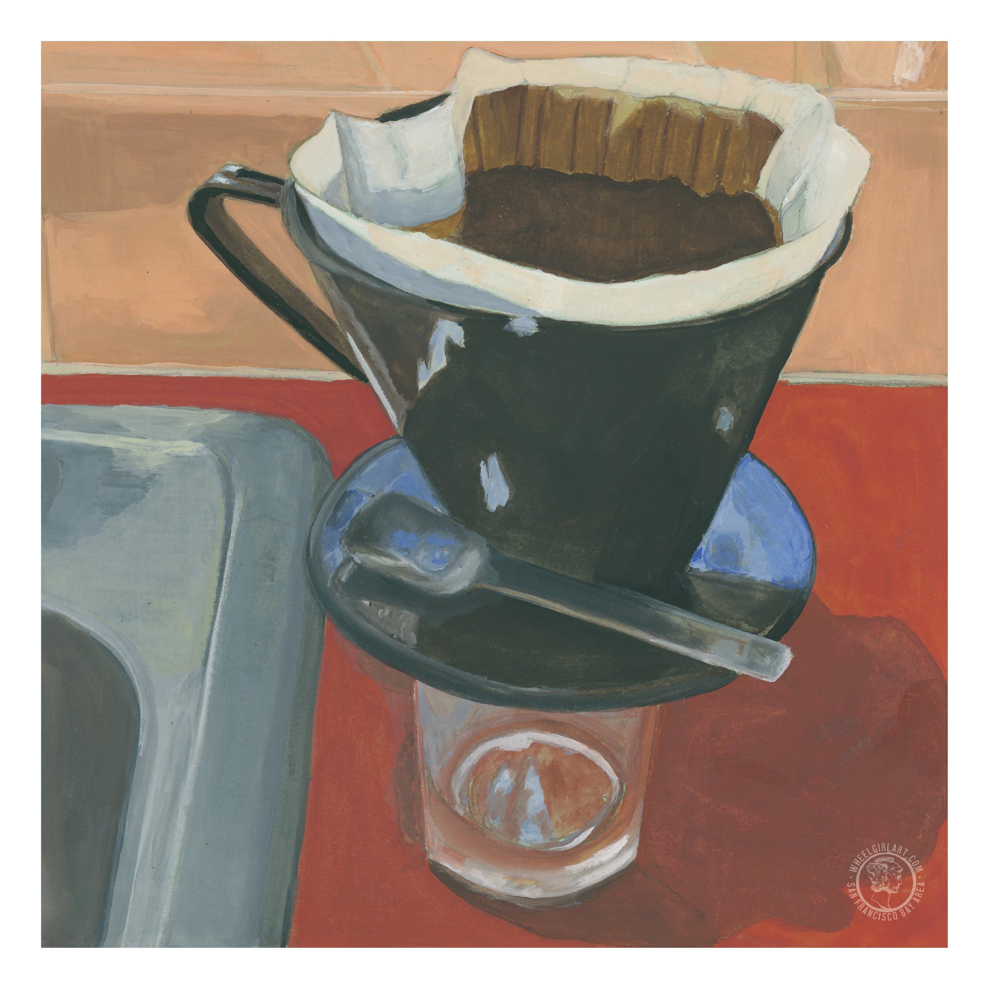 Wheelgirlart Coffee with Blue Skies All Day is a 12in wide x 12in high fine art HD ChromaLuxe® lightweight, modern aluminum metal print. These lightweight, colorful, modern metal prints look great in any room, and they are water and humidity resistant, so they are also suitable for many types of sheltered outdoor rooms, garages, kitchens, and bathrooms. The image is infused onto the aluminum metal matte white surface via a permanent heat-and-pressure process.  The hanger attached to the back of the aluminum panel floats the image away from the wall and creates an attractive shadow line. No frame is required. (All Wheelgirlart HD ChromaLuxe® metal prints are reproductions of original hand-painted artwork.)