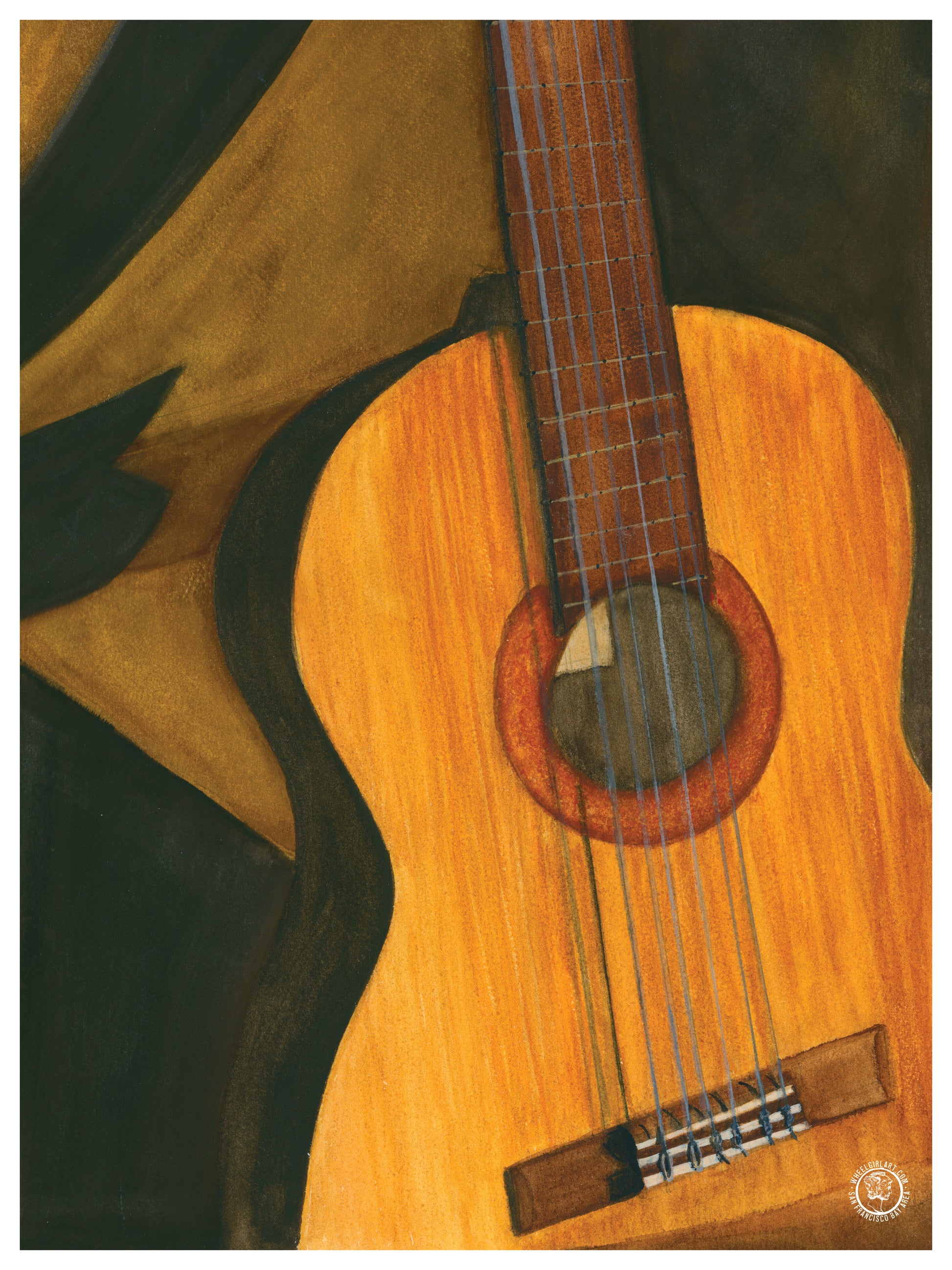 Wheelgirlart Guitar Spanish and Classical is a 12in wide x 16in high fine art HD ChromaLuxe® lightweight, modern aluminum metal print. These lightweight, colorful, modern metal prints look great in any room, and they are water and humidity resistant, so they are also suitable for many types of sheltered outdoor rooms, garages, kitchens, and bathrooms. The image is infused onto the aluminum metal matte white surface via a permanent heat-and-pressure process. The hanger attached to the back of the aluminum panel floats the image away from the wall and creates an attractive shadow line. No frame is required. (All Wheelgirlart HD ChromaLuxe® metal prints are reproductions of original hand-painted artwork.)