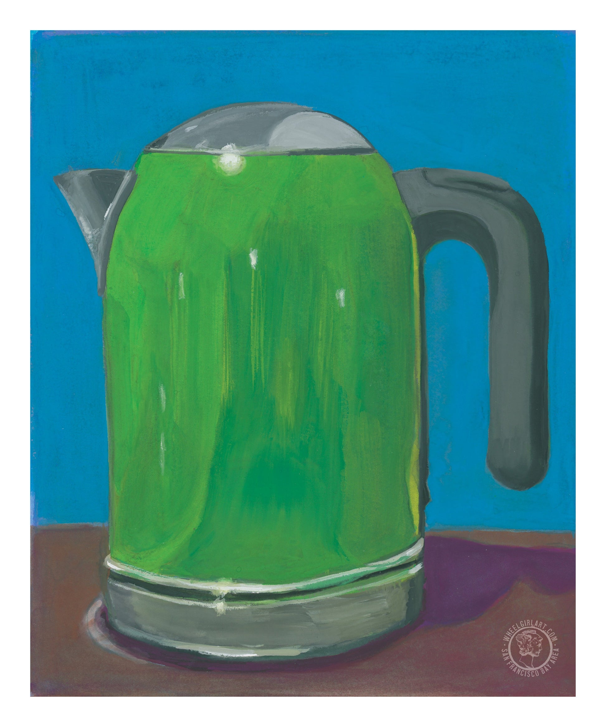 Wheelgirlart Kettle Green is a 10in wide x 12in high fine art HD ChromaLuxe® lightweight, modern aluminum metal print. These lightweight, colorful, modern metal prints look great in any room, and they are water and humidity resistant, so they are also suitable for many types of sheltered outdoor rooms, garages, kitchens, and bathrooms. The image is infused onto the aluminum metal matte white surface via a permanent heat-and-pressure process. The hanger attached to the back of the aluminum panel floats the image away from the wall and creates an attractive shadow line. No frame is required. (All Wheelgirl HD ChromaLuxe® metal prints are reproductions of original hand-painted artwork.)