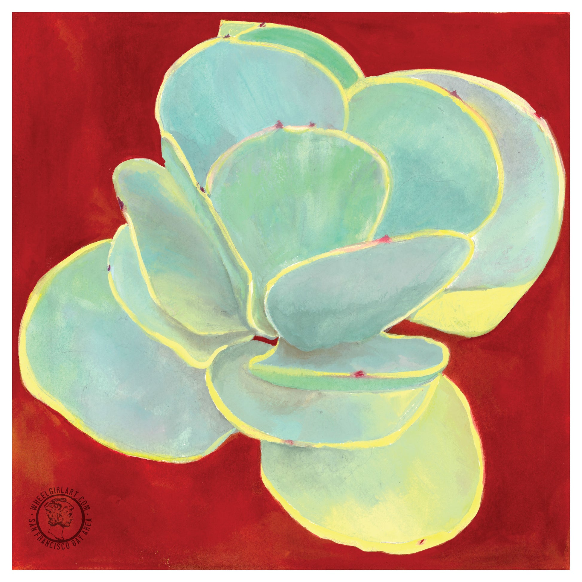 Wheelgirlart Paddle Plant Succulent is a 12in wide x 12in high fine art HD ChromaLuxe® lightweight, modern aluminum metal print. These lightweight, colorful, modern metal prints look great in any room, and they are water and humidity resistant, so they are also suitable for many types of sheltered outdoor rooms, garages, kitchens, and bathrooms. The image is infused onto the aluminum metal matte white surface via a permanent heat-and-pressure process. The hanger attached to the back of the aluminum panel floats the image away from the wall and creates an attractive shadow line. No frame is required. (All Wheelgirlart HD ChromaLuxe® metal prints are reproductions of original hand-painted artwork.)