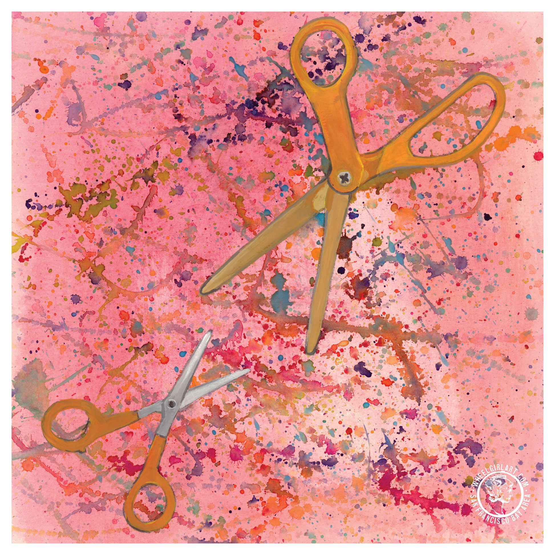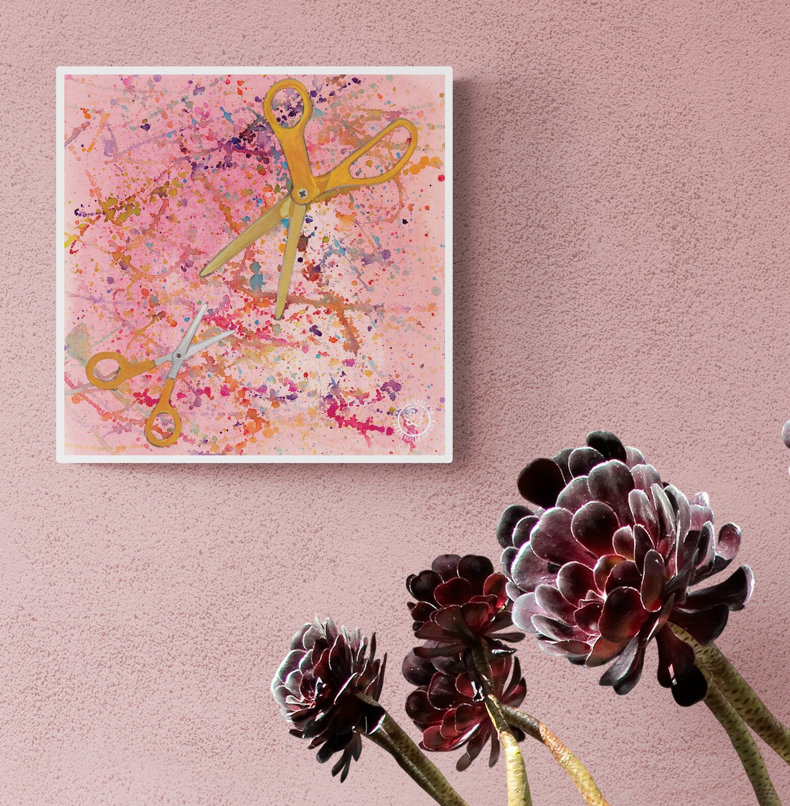 Wheelgirlart Scissors 2 Talking is a 12in wide x 12in high fine art HD ChromaLuxe® lightweight, modern aluminum metal print. These lightweight, colorful, modern metal prints look great in any room, and they are water and humidity resistant, so they are also suitable for many types of sheltered outdoor rooms, garages, kitchens, and bathrooms. The image is infused onto the aluminum metal matte white surface via a permanent heat-and-pressure process.  The hanger attached to the back of the aluminum panel floats the image away from the wall and creates an attractive shadow line. No frame is required. (All Wheelgirlart HD ChromaLuxe® metal prints are reproductions of original hand-painted artwork.)