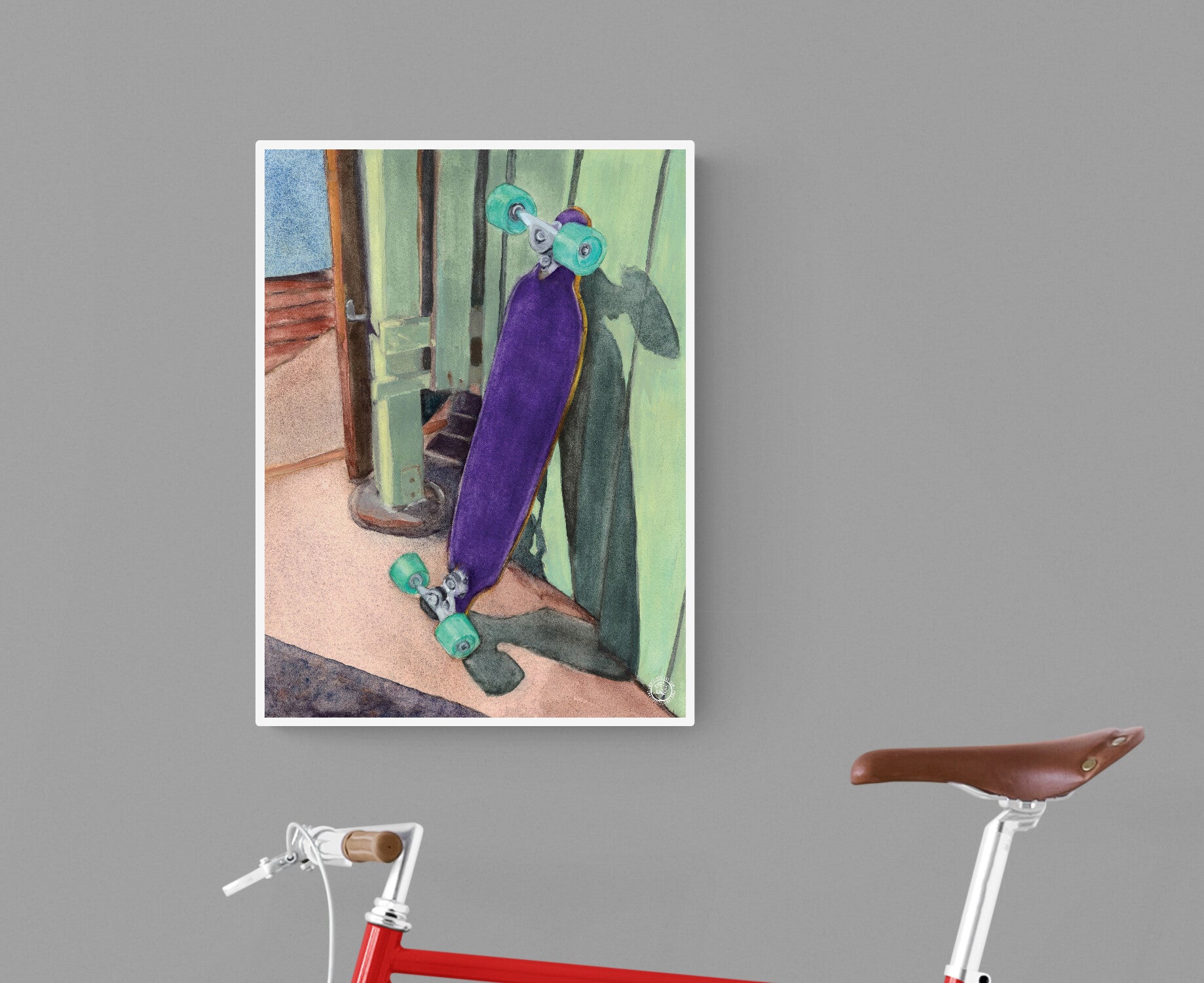 Wheelgirlart Skateboard Purple SK8 No. 3 is a 12in wide x 16in high fine art HD ChromaLuxe® lightweight, modern aluminum metal print. These lightweight, colorful, modern metal prints look great in any room, and they are water and humidity resistant, so they are also suitable for many types of sheltered outdoor rooms, garages, kitchens, and bathrooms. The image is infused onto the aluminum metal matte white surface via a permanent heat-and-pressure process. The hanger attached to the back of the aluminum panel floats the image away from the wall and creates an attractive shadow line. No frame is required. (All Wheelgirlart HD ChromaLuxe® metal prints are reproductions of original hand-painted artwork.)